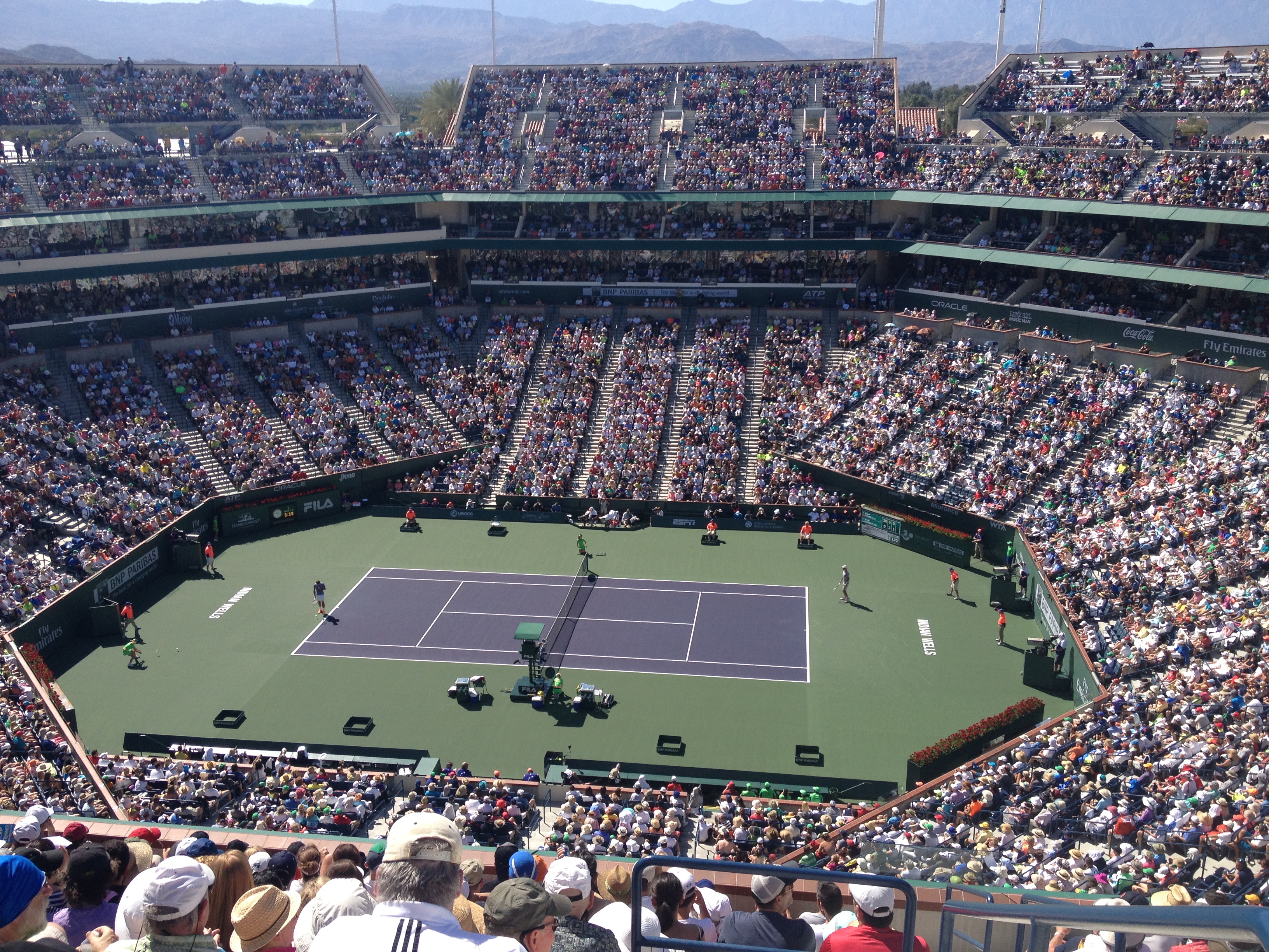 Roger Federer (serving on left) vs Novak Djokovic in the 2014 BNP Paribas Open final at Indian Wells, CA