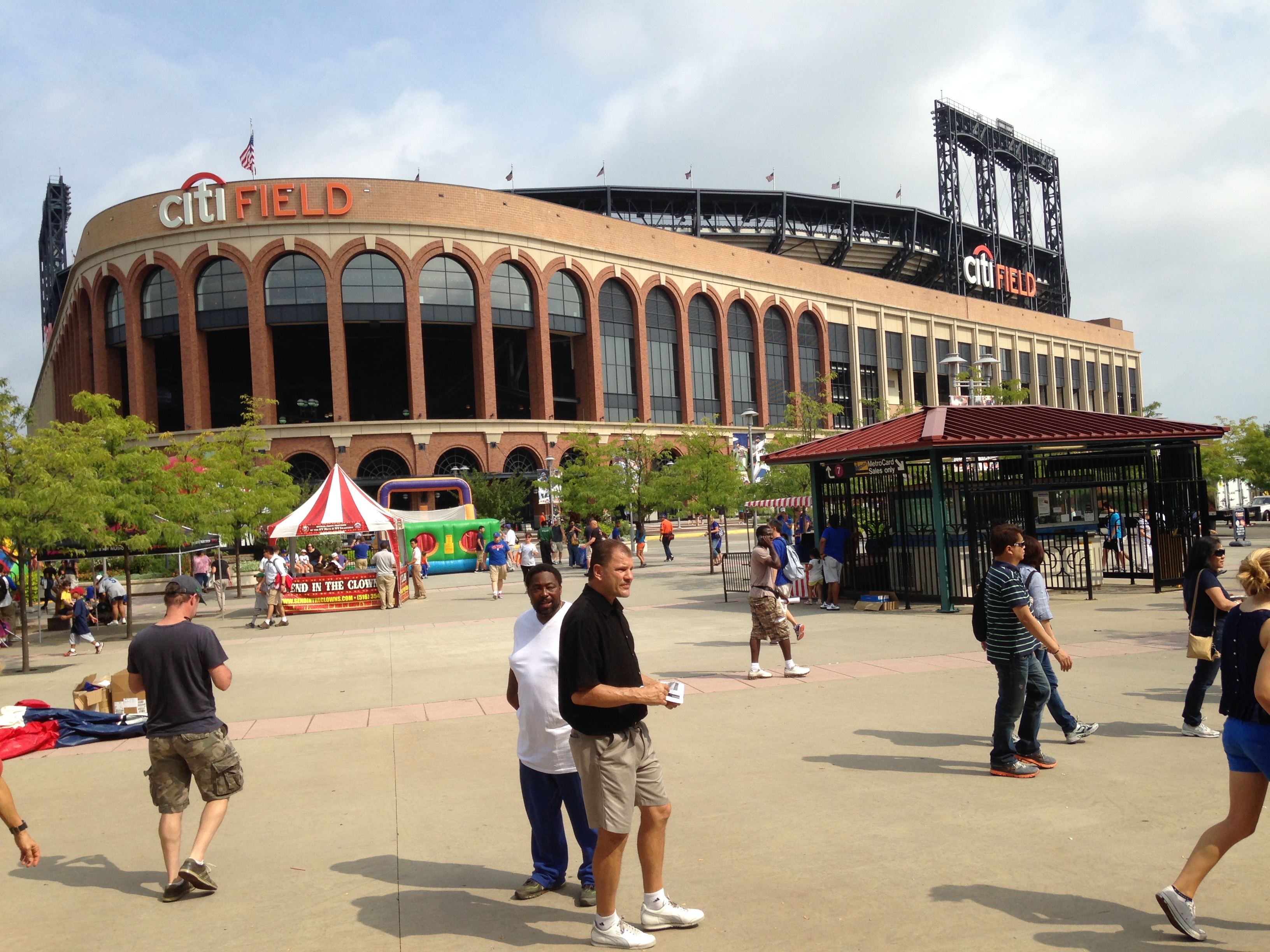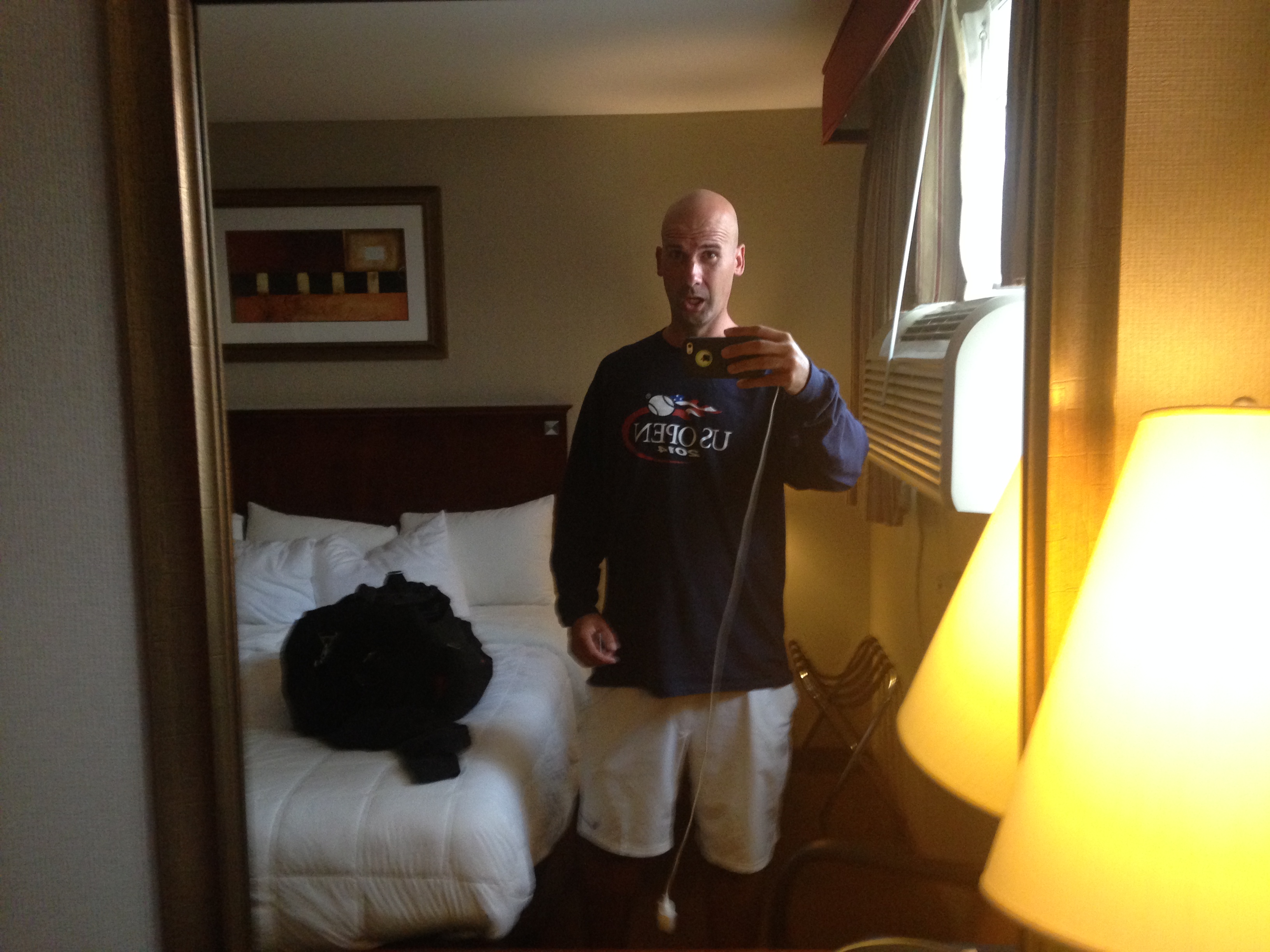 It was about 8:30 by then and the matches were basically over except in the stadium, which has a separate evening session. We could have watched that on one of the giant screens, but the match wasn’t particularly appealing and we had tickets for Sunday, too, so we decided to just find our hotel and get some sleep. Even the GPS we were using didn’t have much trouble locating this place on the outskirts of nearby LaGuardia Airport. Finding it, though, proved to be the least of our worries. The hotel was right next to a rental-car lot, and to keep the cars from being stolen in a sketchy neighborhood, the rental company had erected a large chain-link fence topped by barbed wire. All we needed was a guard tower with giant searchlights trained on us and we might have been in Cold War-era East Berlin. While we didn’t get a great vibe from the place, we figured it didn’t really matter because we were going right to sleep and would be leaving early in the morning. So I went to check in while Chris looked for a parking spot. Working behind the desk was a powerfully built middle-aged man with brush-cut hair and a pencil-thin mustache named Hilario, but there was nothing at all funny about his situation. The phone was ringing off the hook (hotel rooms in NYC, even two-star ones, are tough to come by over Labor Day weekend) and Hilario, who didn’t look to be the most patient of men, had to give each caller the bad news that the hotel was completely full. So when our assigned room turned out to have just a single king-sized bed I wasn’t about to go back and request a different one. The bed had pillows the size of some of my seventh-grade students, and Chris quickly took one of them and laid it lengthwise atop the center of the coverlet so we both would be able to sleep worry-free. First, though, I needed a shower, which normally is simple enough. Not this time. An instruction box on the wall said “pull ring out for shower”. There was a bubble-type apparatus attached to the shower head, so I started pulling that. Pulling, even increasingly hard pulling, didn’t give me the result I wanted, as water just continued to flow from the tap instead of from the shower head. When what I’m doing isn’t working but there’s no obvious alternative, I tend to just try something different and hope for the best. What I tried in this case was unleashing a string of unkind words at a volume that drew Chris’s attention in the next room. He came to investigate and finally pulled some small attachment on the bottom of the tap and, voila, the shower started working. Being in NYC, I’m surprised we didn’t get charged extra for it. Anyway, before Chris could give me too much shit about that, he was asleep in the bed with the seventh-grader-sized pillow down the middle. I got on my half and a few moments later my version of “Super Saturday” was over too.